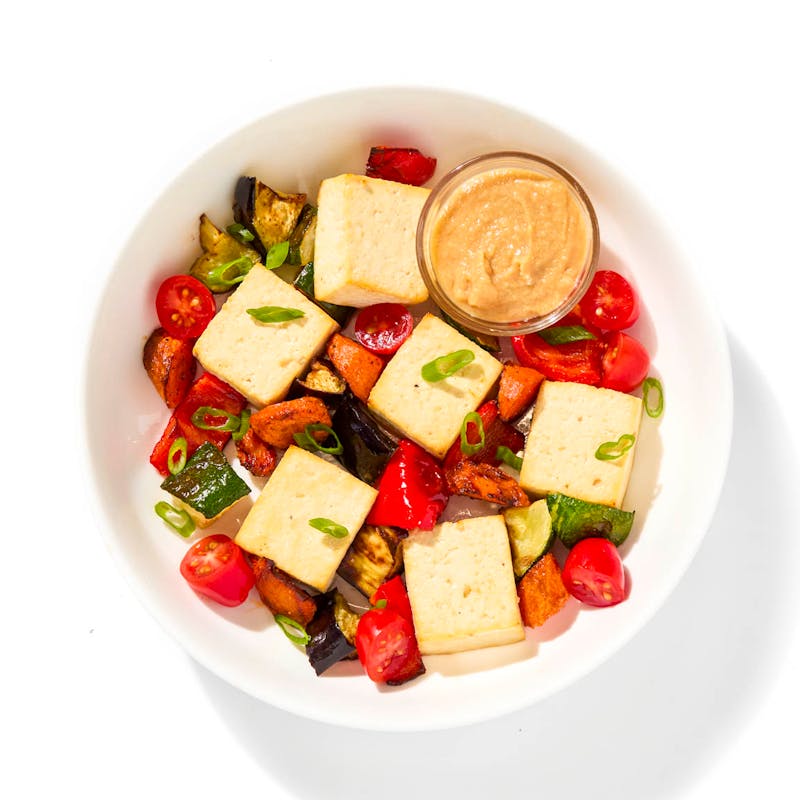 Tender tofu gets oven-baked until golden, then brushed with a sweet-savory miso glaze that caramelizes just right. Roasted eggplant, bell peppers, zucchini, and carrots bring fiber-rich, umami-packed bites to this calorie conscious plate.