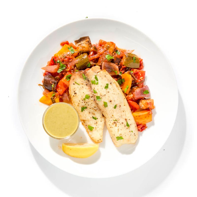 Jump into the flavor of the south of France region with Chef Cedric's Provencal tilapia. This dish features a base of slow-cooked ratatouille, layered with oven-roasted tilapia and fresh parsley on top, and an olive spread on the side.