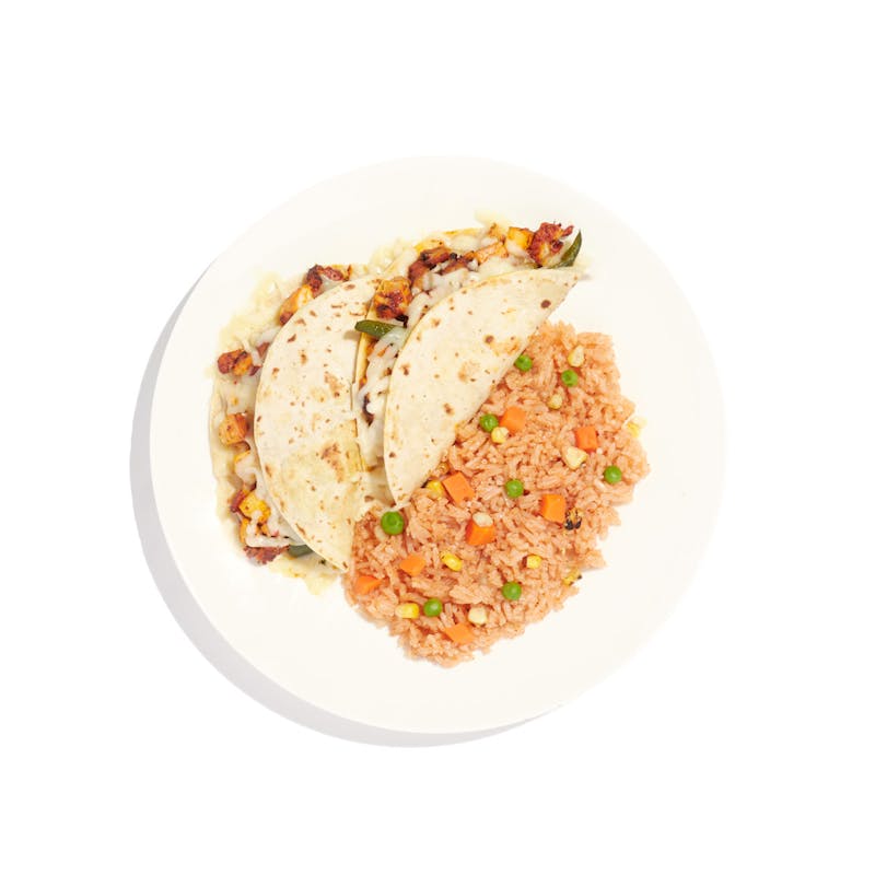 This grilled chicken quesadilla uses quality ingredients for an all-time favorite snack or meal. Chef Maribel puts all the love in the details, using her signature achiote marinade on the chicken, which is complemented by caramelized onion, poblanos, and tomato in the filling. Melty Oaxaca and pepper jack cheeses add richness, and a lightly toasted flour tortilla envelops all these tasty ingredients. Served with a side of roasted tomato salsa and Mexican red rice with corn, carrots, and peas, this is everything you want and more.