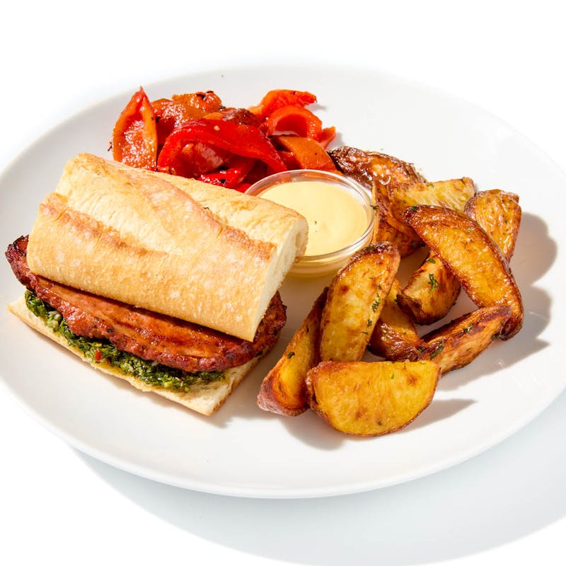 Choripán is a combination of the words “chorizo” (sausage) and “pan” (bread), and every bite of this unforgettable sandwich delivers warmth, comfort, and the taste of Latin America. Juicy, grilled chorizo sausage is topped with zesty chimichurri, bringing a burst of fresh herbs, garlic, and vinegar for that classic Argentine flair, then ticked inside fresh, fluffy Cuban bread. To elevate the flavor even more, we’ve added a luscious aji amarillo aioli, giving you a hint of Peruvian heat balanced with creamy goodness. Accompanied by perfectly roasted red bell peppers and potatoes, this dish is the ideal combination of smoky, savory, and spicy.