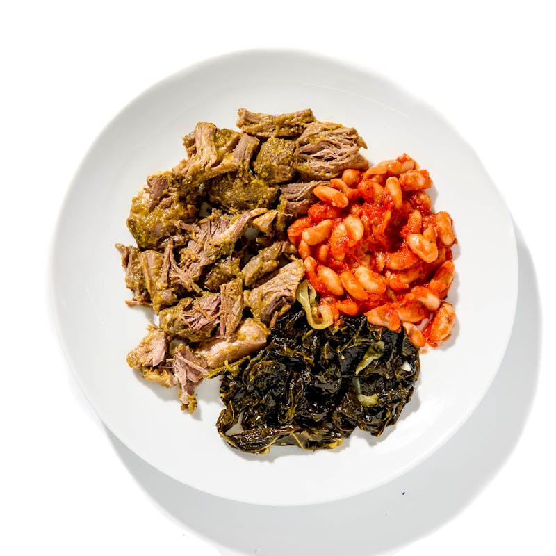 This dish is a warm embrace of tradition and soul, where the bold spice of the Southwest meets the deep comfort of the South. The green chile pork is slow-braised with fire-roasted Anaheim chiles, tomatillos, and poblanos, building smoky heat and depth. Creamy cannellini beans add heartiness, while braised collard greens bring slow-cooked richness to the plate.