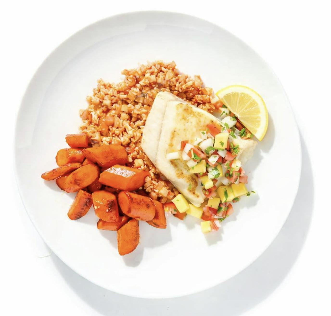 From the sun-soaked coast of Baja Mexico, this dish channels the region’s soulful simplicity. Mahi mahi, tender and lightly seared, is paired with caramelized carrots, a bright mango pico de gallo, and a wholesome Mexican-style cauliflower rice that’s seasoned with tomato, cumin, and a splash of broth.