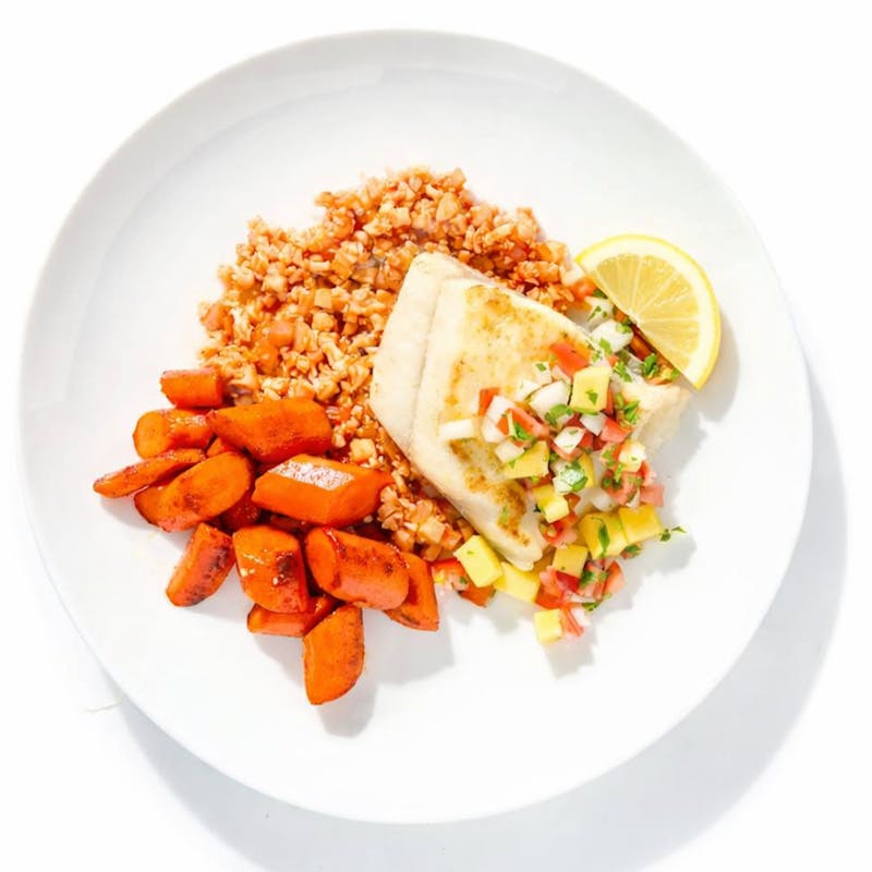 Mango, Canola and Olive Oil Blend, Butter, Extra Virgin Olive Oil, Carrots, Plum Tomato, Serrano Peppers, Black Pepper, Cumin, Cilantro, Garlic, Honey, Kosher Salt, Lemon Zest, Onion, White Pepper, Kosher Salt, Mahi Mahi, Tomato Sauce, Lime Juice, Cayenne Powder, Cauliflower