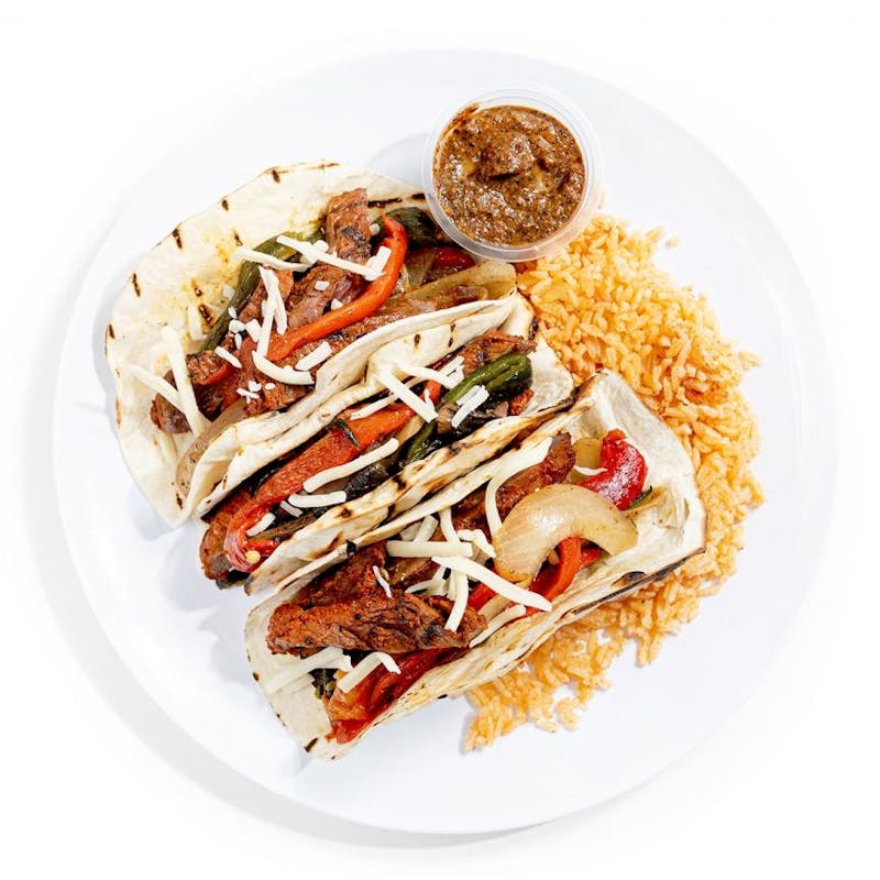 Raised in San Antonio, fajitas were a weekend staple for Chef Maribel, with fresh-off-the-grill steak, flour tortillas, and all the accouterments. Chef Maribel's version lets you build your own fajita-inspired tacos with flour tortillas, char-grilled marinated skirt steak, and traditional rajas (grilled portobello mushrooms and poblano peppers). Top your tacos with pepperjack cheese and Chef's handmade fire-roasted tomato salsa, and enjoy with a side of red rice for a super satisfying Taco Tuesday, any day of the week.