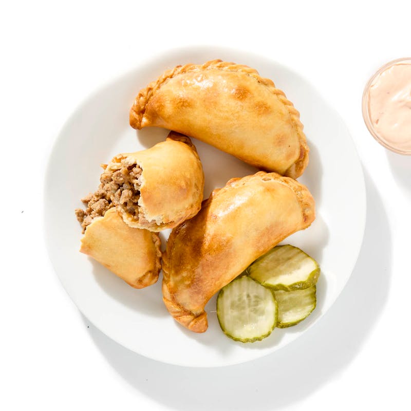 Empanada Dough, Ground Beef, Onion, American Cheese, Pickles, Mayonnaise, Garlic, Relish, Dijon Mustard, Ketchup, All Purpose Flour, Sriracha, Kosher Salt, Granulated Garlic, Black Pepper, Worcestershire Sauce, Granulated Onion