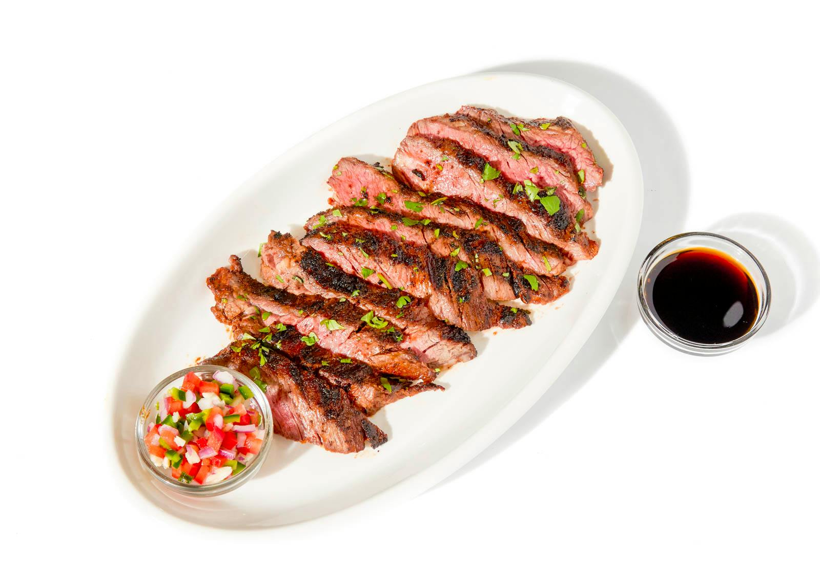 This dish features grilled flank steak marinated in a savory umami-soy blend, crafted to balance deep flavor and natural meatiness. Chef Silvio pairs it with salsa criolla plus more soy-sesame sauce on the side for good measure.