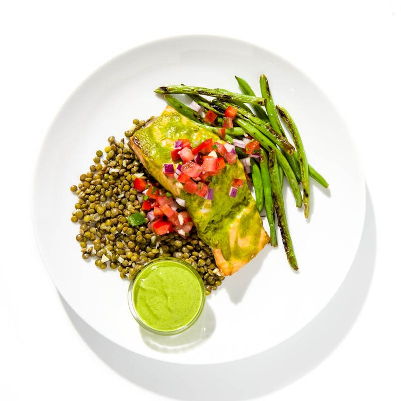 High in protein, rich in omega-3s, and bursting with fresh flavor—this colorful, nutrient-packed plate does it all. Oven-roasted salmon is coated in a lush Aji Verde sauce, made with cilantro, jalapeño, aji amarillo, and a touch of feta for richness. It’s paired with hearty French lentils simmered with warming spices, blistered green beans, and a tangy salsa criolla.