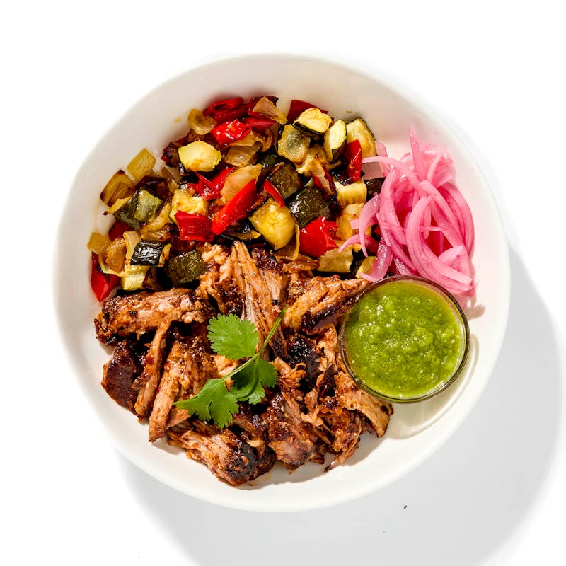 Smoky chipotle and garlic sink deep into this slow-roasted pork shoulder dish. The pork rests over a bed of roasted carrots, zucchini, cipollini onions, and red pepper, with bright tomatillo salsa and sharp pickled red onion served on the side. Finished with toasted pumpkin seeds and fresh cilantro, this Mexican-inspired dish is bold, vibrant, and completely keto-friendly.