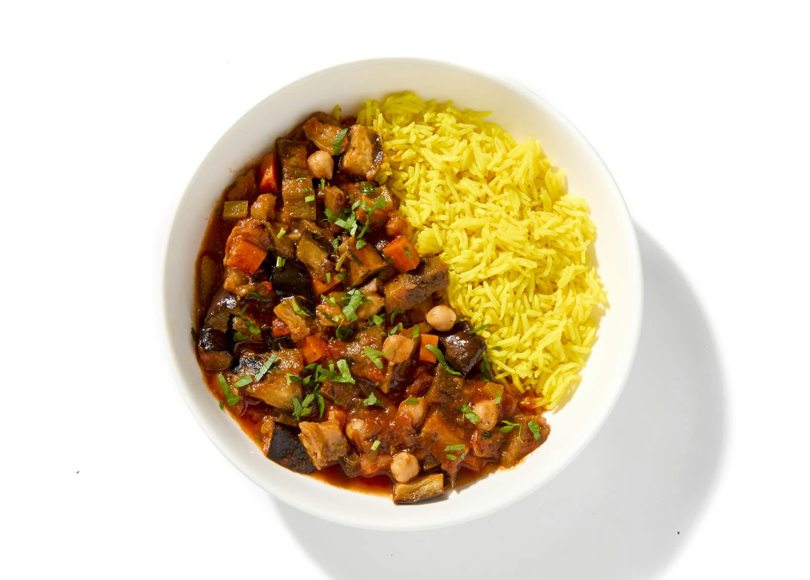 This comforting vegan stew simmers fire-roasted and charred eggplant with chickpeas, carrots, celery, and red onion in a smoky tomato broth. Miso, cumin, and liquid smoke deepen the flavor while turmeric basmati rice on the side makes it a full, warming meal.