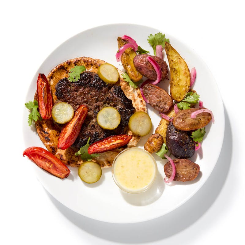 For this fusion of Mediterranean and American favorites, Chef Einat combines juicy ground beef with herbs and spices (and a touch of jalapeño for heat), then smashes the patties flat on a griddle for those irresistibly crisp, lacy edges. She sandwiches each one into whole wheat pita bread filled with blistered tomatoes and thin-sliced red onions seasoned with tangy sumac. On the side: flavorful za’atar roasted fingerling potatoes. The accompanying sauce—a bright, zesty blend of peperoncino, lemon, and garlic—enlivens every bite of this balanced, nourishing meal.