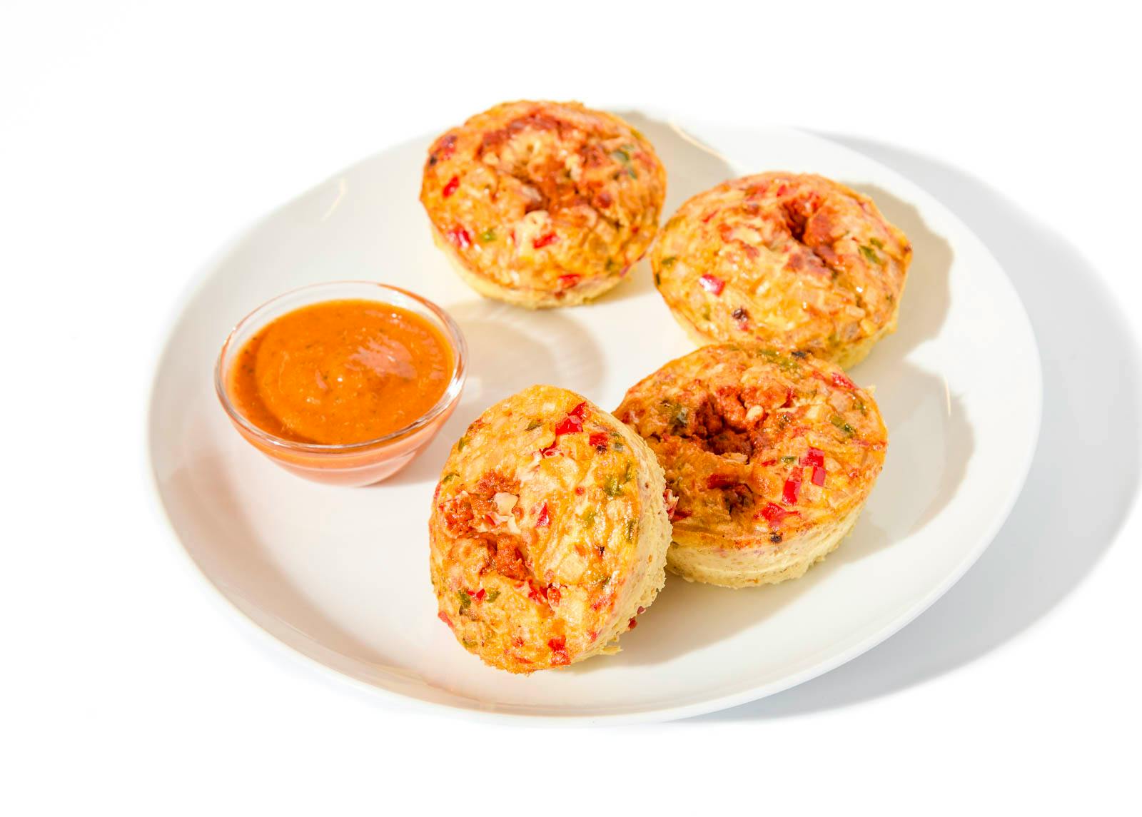 Four steam-baked egg bites come infused with harissa and Mediterranean spices for a flavorful, calorie-conscious, and protein-packed breakfast or snack. Served with a bright, tomato dipping sauce on the side.