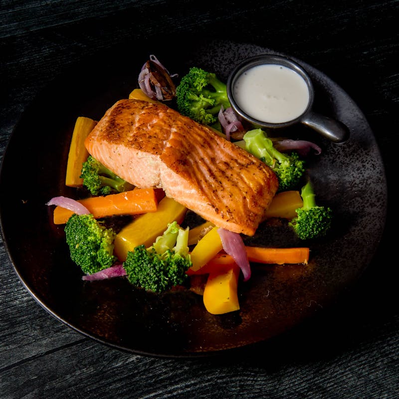 Inspired by the Patagonian trouts that swim the waters between the great mountains of Southern Argentina, Chef Maia imbues that same special energy in this dish. Fresh steelhead trout is marinated in in vodka, fresh dill, sea salt and ground pepper then roasted to perfection. On the side, you get a bright array of colorful veggies like broccoli, asparagus, carrots and red onions, all cooked in a tangy, creamy coconut-lemon sauce.