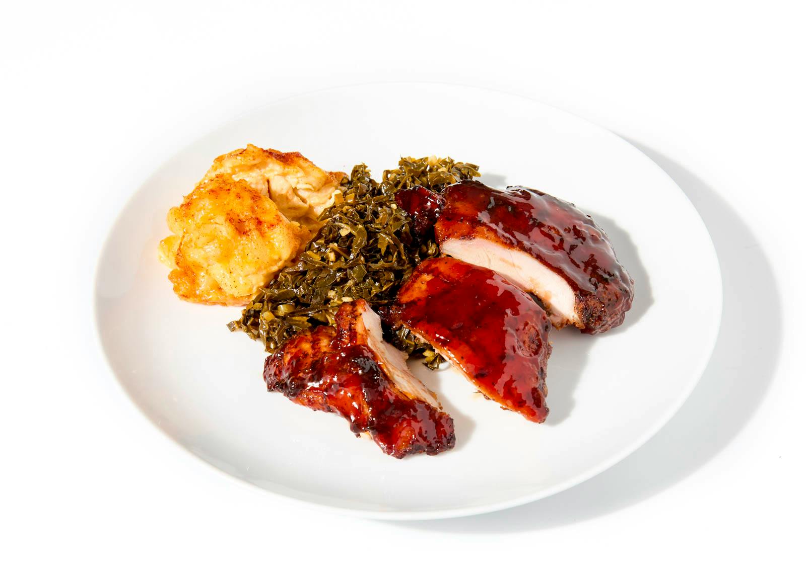 All the flavors of authentic BBQ on one plate! This dish pairs a well-marinated, barbecue sauce-glazed chicken leg with tasty baked mac and cheese and collard greens. Bursting with Southern flavor, this meal will satisfy any and all comfort food cravings.
