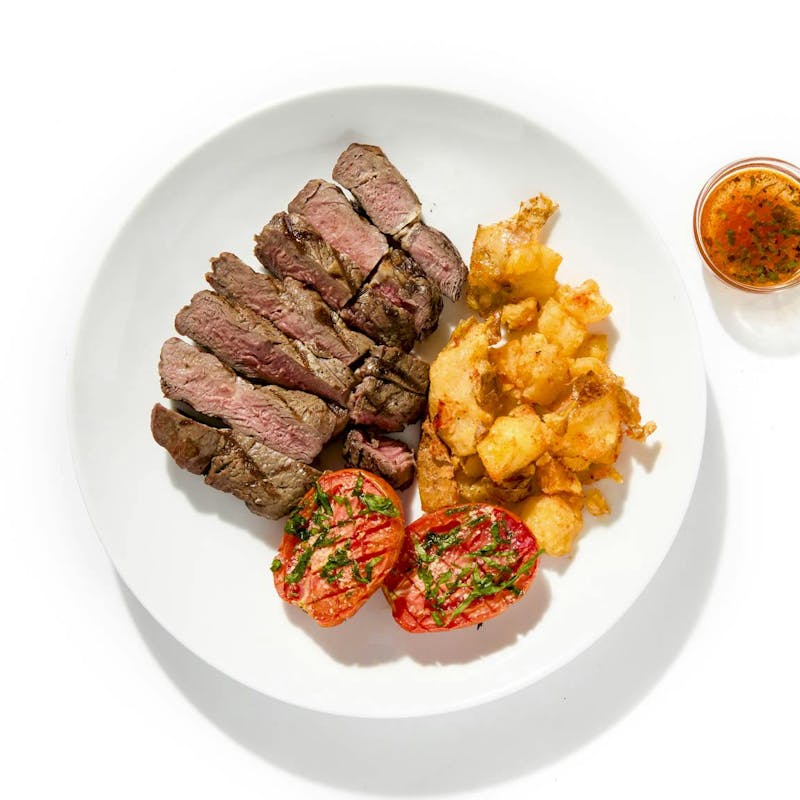 A signature of Argentinian asado, or wood-fired open grilling, this grass-fed beef ribeye comes with baked crushed potatoes spiced with smoked paprika, garlic, olive oil, and sea salt, as well as sweet roasted tomatoes and chimichurri on the side. If you've been to Argentina, you'll recognize the staple flavors of the cuisine in every bite. If you haven't, prepared to be transported!