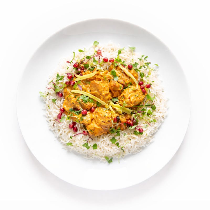 Canned Tomato, Cayenne Powder, Pomegranate Seeds, Spice, Cardamom, Green, Whole, Cardamom Pod, Chicken Thigh, Canola and Olive Oil Blend, Bay Leaf, Butter, Fenugreek, Dill, Garlic Powder, Cumin, Garam Masala, Cinnamon Stick, Cilantro, Garlic, Honey, Sugar, Heavy Cream, Onion, Basmati Rice, Kosher Salt, Lime Juice, Greek Yogurt, Ginger