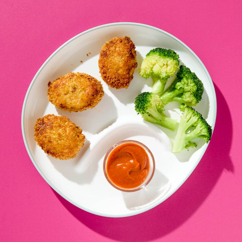 Chef John's lighter take on the kid classic features baked nuggets made with ground chicken, chickpeas, and hidden veggies. On the side: buttery broccoli and a sweet-tangy BBQ sauce that blends in tomato, squash and carrot.