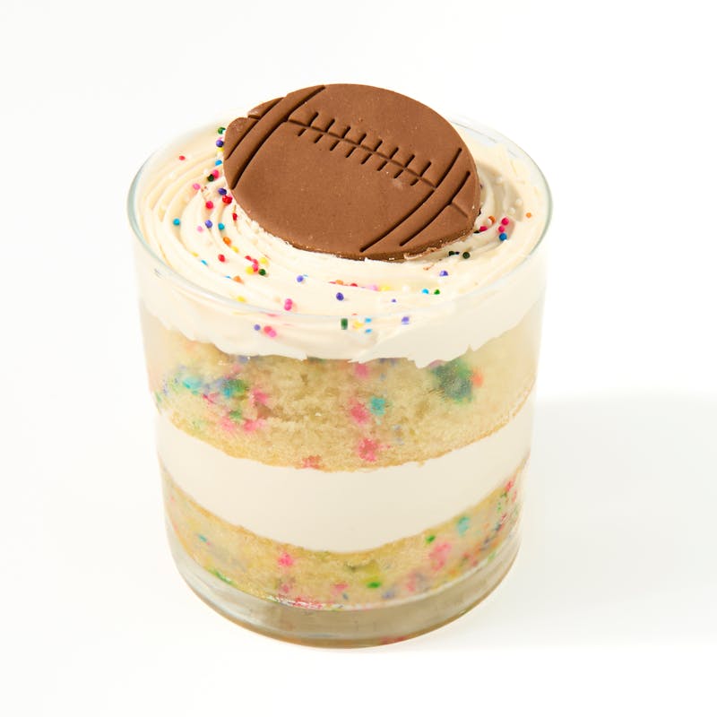 Layers of moist funfetti cake alternate with fluffy vanilla buttercream, creating a delightful treat. Crowned with a whimsical sugar football, this cake is the ultimate addition to your game day festivities, adding a touch of sweetness to every touchdown celebration.