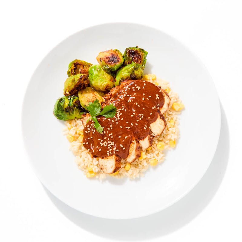 One of Chef Jose’s most-loved dishes, this meal features tender chicken breast covered in a richly spiced mole poblano—layered with chiles, cacao, and warm spices. It’s served over textured rice mixed with sweet corn kernels, alongside agave-glazed Brussels sprouts for contrast. Bold, balanced, and rooted in tradition, every bite offers a new layer of flavor.