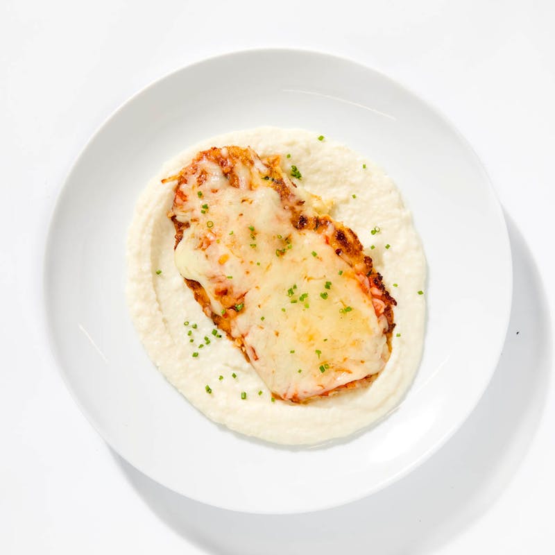 This "breaded" chicken cutlet is coated with almond meal for a nice crispy gluten-free crust and topped with tomato sauce and cheese for a low-carb twist on classic chicken parmesan. It's served over a creamy cauliflower mash.