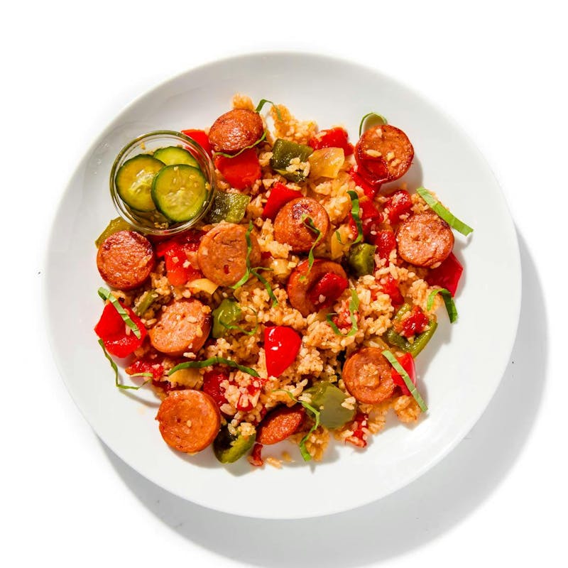 Pork, Sausage, Italian, Hot, Cucumber, Sesame Oil, Canola and Olive Oil Blend, Extra Virgin Olive Oil, Cajun Spice, Spicy Chilli Sauce, Calrose Rice, Black Pepper, Garlic, Canned Tomato, Sugar, Onion, Light Soy Sauce, Kosher Salt, Chicken Base, Rice Wine Vinegar, Green Bell Pepper, Basil, Red Bell Pepper, Toasted Sesame Seeds