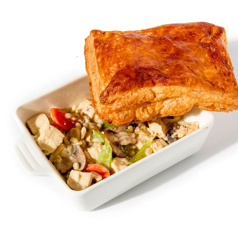 Chicken Breast, Puff Pastry, Half and Half, Crimini Mushroom, Peas, Onion, Carrots, Butter, Barley, Celery, All Purpose Flour, Chicken Base, Seasoning, Sugar, Shiitake Mushroom, Thyme, Kosher Salt, Coriander Seeds, Black Pepper, Granulated Garlic, Fennel Seed, Crushed Red Pepper