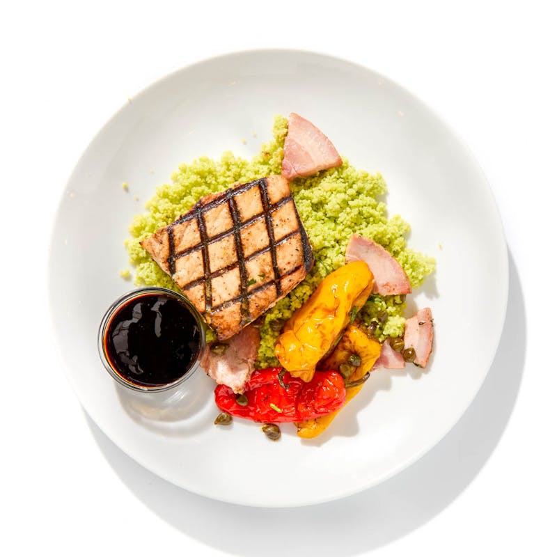 Mediterranean flavors shine in this elevated dish, featuring golden-seared swordfish served atop a bed of creamy, fennel-infused polenta. It’s paired with smoky pancetta and a slowly cooked peperonata of sweet bell peppers, onions, and capers, all tied together with a drizzle of olive oil and balsamic glaze.