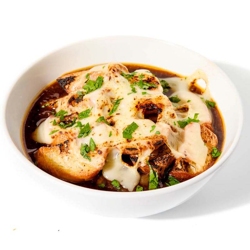 Here's a deep, brothy hug in a bowl: caramelized onions are simmered slowly in a rich, red wine-spiked beef broth, then seasoned with thyme and bay leaf. It's topped with a slice of toasted baguette and finished with a bubbling layer of Gruyère cheese.