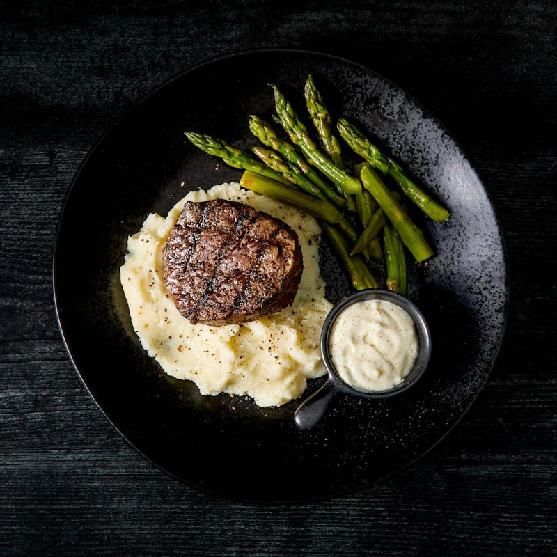 Gorgonzola cheese, Tenderloin Steak, American Grana Cheese, Canola and Olive Oil Blend, Butter, Extra Virgin Olive Oil, Asparagus, Black Pepper, Garlic, Heavy Cream, Kosher Salt, Black Pepper, Yukon Potatoes, Thyme, Whole Milk
