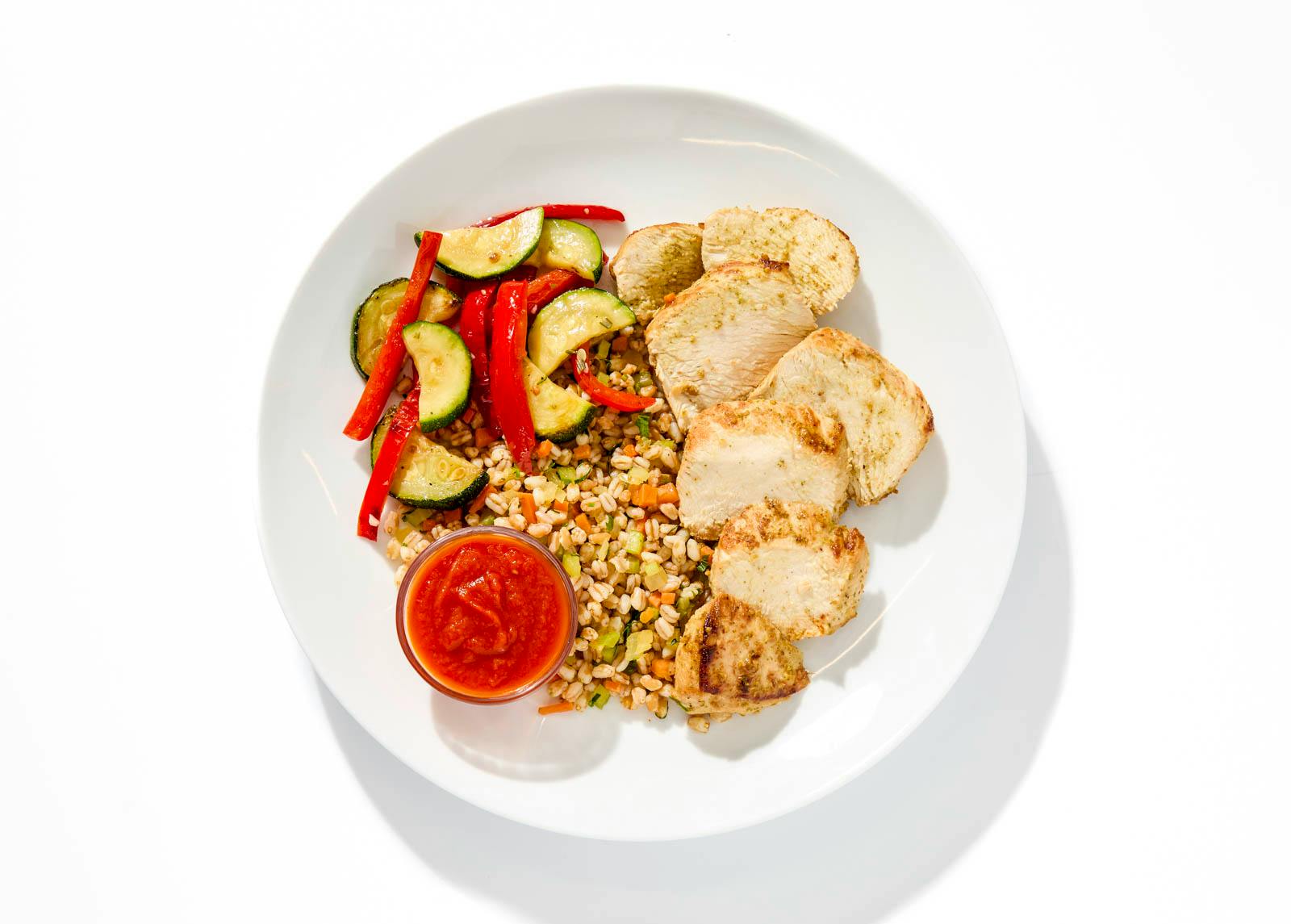 Veg, Tomatoes, Whole, Canned, Italian, Extra Virgin Olive Oil, Oregano, Carrots, Rosemary, Red Wine Vinegar, Celery, Black Pepper, Chili Powder, Garlic, Fennel Seed, Lemon Zest, Oregano, Sugar, Zucchini, Onion, Farro, Kosher Salt, Lemon Juice, Crushed Red Pepper, Basil, Chicken Breast, Red Bell Pepper, Italian Parsley