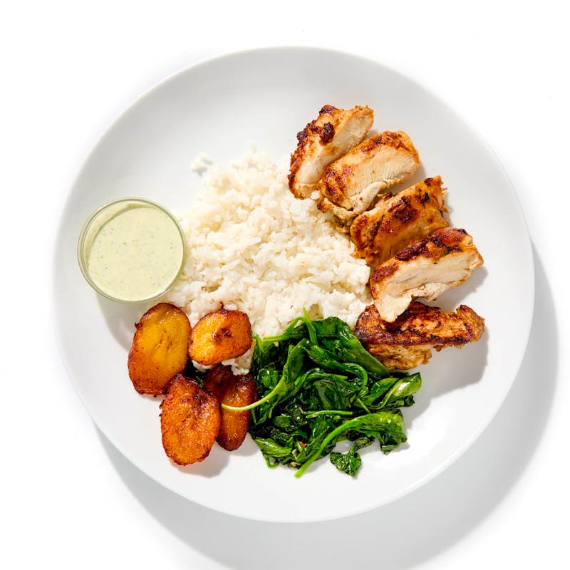 Marinated in a blend of cumin, fennel, garlic, and vinegar before hitting the grill, these chicken thighs pick up smoky char and juicy tenderness. They're served with sweet fried plantains, spinach sautéed in garlic, and fragrant coconut jasmine rice—all anchored by a zippy green sauce spiked with jalapeño, lime, and cilantro.