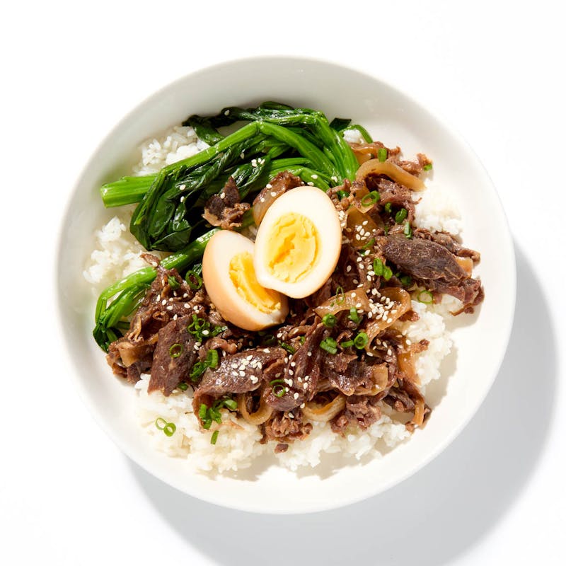 For this traditional, comforting Japanese donburi (rice bowl), Chef Mike stir-fries zesty onions and tender, flavorful slices of ribeye to get them deliciously caramelized, then simmers the combination in sweet and savory soy and dashi broth, infusing it with umami richness. He spoons a hearty serving over a bed of fluffy rice. On the side: crisp-tender blanched yu choy and another umami bomb—a jammy hard-cooked egg marinated overnight in soy sauce. Super-satisfying and rich in protein, this a perfect post-workout meal.