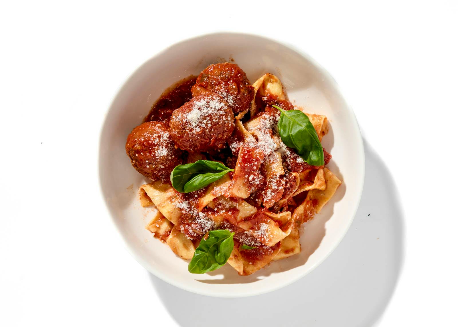 Chef Rocco’s beef-and-pork meatballs simmer slowly in tomato sauce, soaking up garlic, herbs, and a touch of heat. The pappardelle comes wide and tender, built to hold onto that sauce, with fresh basil and grated Grana Padano bringing a fresh finish.