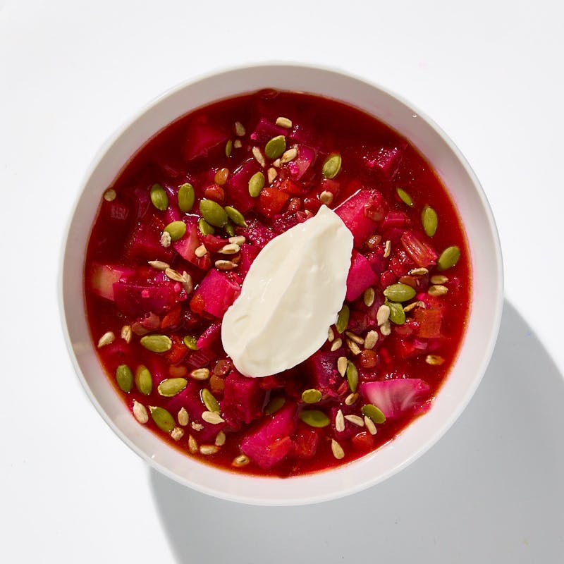 Chef Lena’s twist on classic Eastern-European borscht nourishes body and soul. She starts with beets, which give the soup its gorgeous jewel-toned color—plus a host of antioxidants. They’re gently simmered with potatoes, cabbage, and protein- and fiber-packed green lentils in flavorful ginger-infused broth for even more plant-powered nutrition. Swirl in the accompanying creamy lemon coconut yogurt then top off your bowl with crunchy garlic-toasted sunflower and pumpkin seeds for tasty textural contrast. This soup may be calorie-conscious, but there’s absolutely no compromise on flavor.