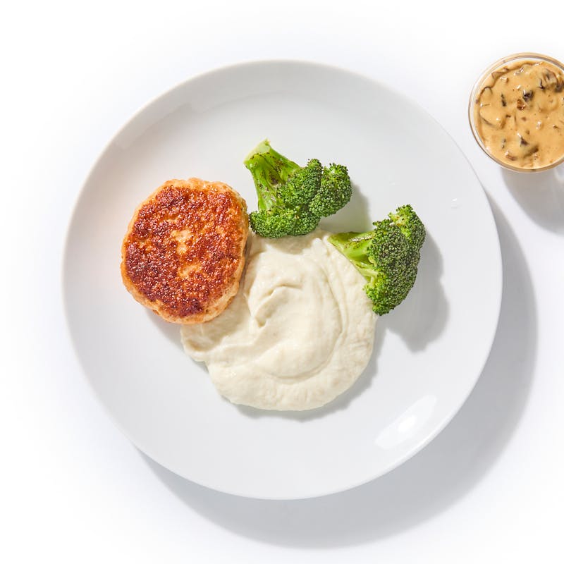 Sink your fork into a tender, juicy turkey patty smothered in a rich, savory mushroom gravy. Paired with creamy cauliflower puree and roasted seasonal broccoli, this dish brings all the warmth of a home-cooked classic with a light, modern twist.