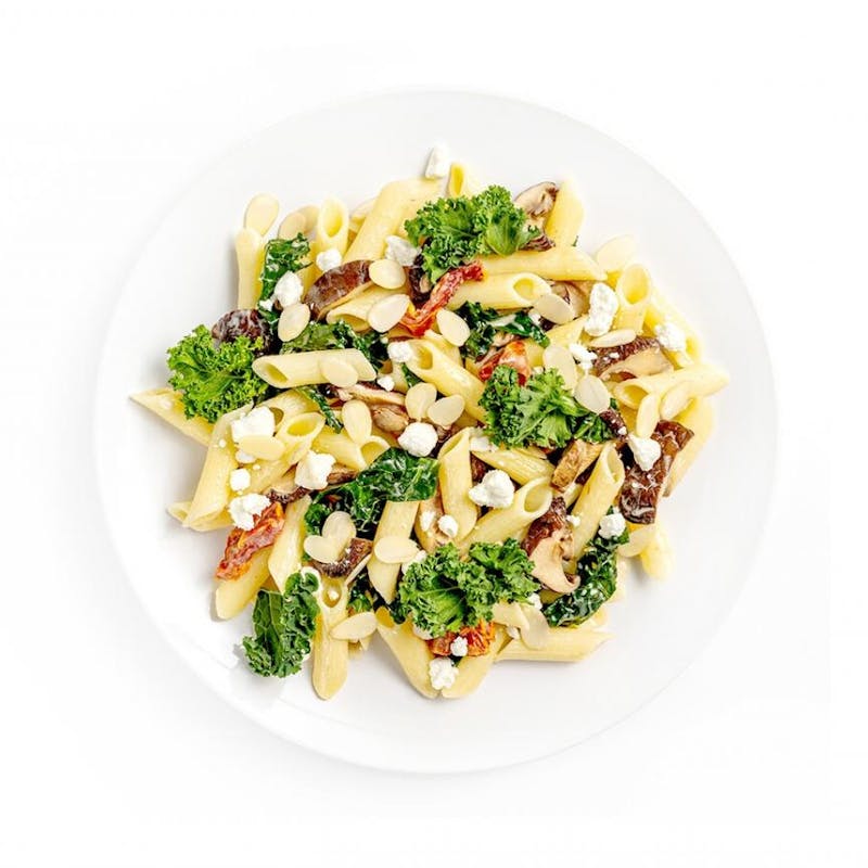 Organic Heavy Cream, Sun Dried Tomatoes, Almonds, Penne, Garlic, Heavy Cream, Kosher Salt, Goat Cheese, Shiitake Mushroom, Truffle Oil, Organic Kale