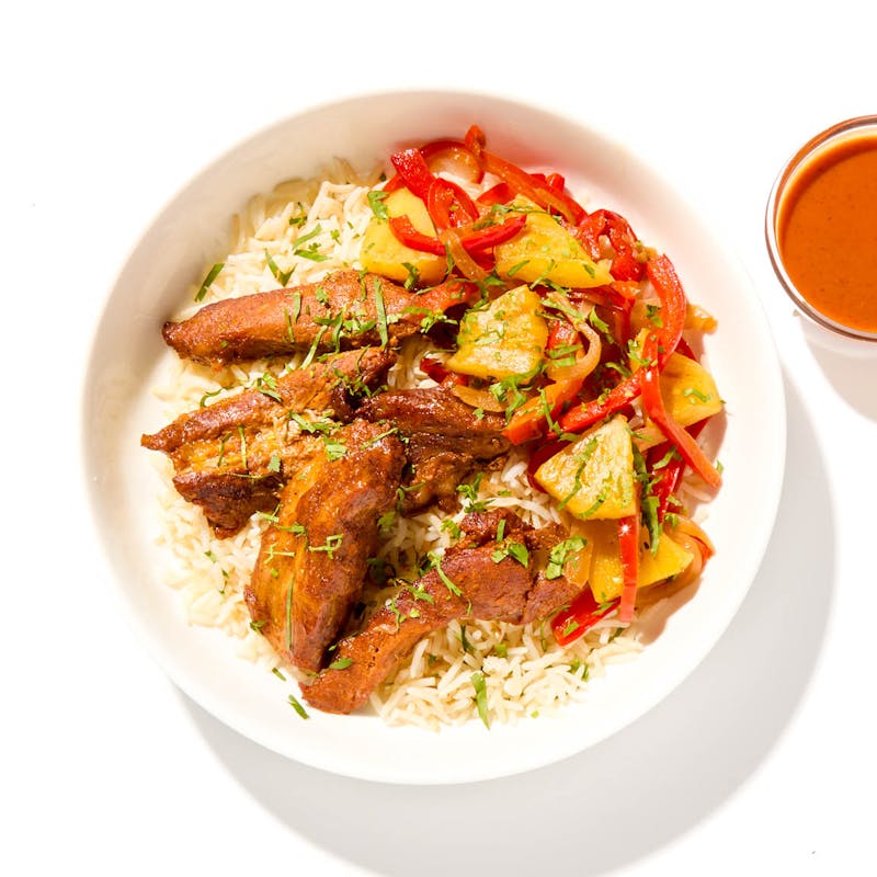 Discover the irresistible flavors of Chef Jose's Al Pastor Pork Fajita Bowl, exclusively crafted for CookUnity customers. This delectable dish boasts a 24-hour marinated pork shoulder, slow-roasted to perfection and delicately sliced. Served over fluffy rice with charred peppers, onions, and pineapple, all drenched in an irresistible Al Pastor sauce. The secret blend of herbs and spices, combined with orange juice, charred pineapple, onion, garlic, and achiote reflects Chef Garces' unwavering dedication to delivering an authentic, unparalleled dining experience.