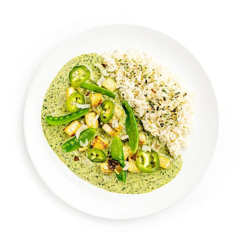 Zhug is a spicy Yemenite condiment made with jalapeño, coriander, cumin, garlic and tons of fresh cilantro, which makes it the perfect addition to spice up fragrant green curry. This vegetarian silky curry is infused with cardamom and kaffir lime and served over snow peas, snap peas, and tofu, and served alongside coconut-scented Basmati rice. Topped with more fresh jalapeño slices and a sprinkle of umami-filled furikake, this is the perfect dish for plant-based heat seekers!
