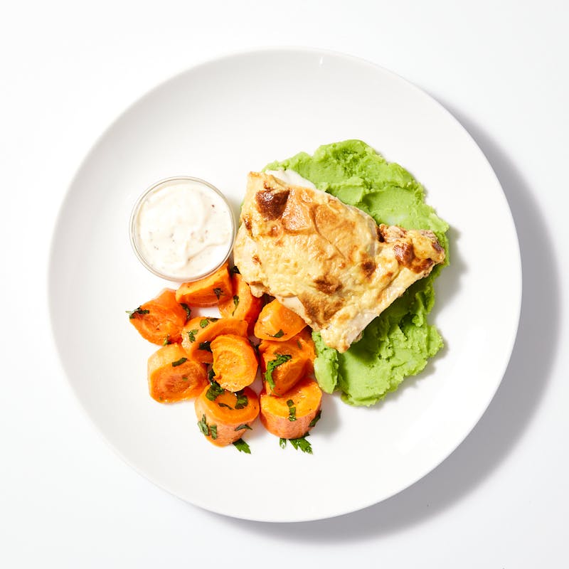 Everything has just a little extra flavor and flair in this dish, from the succulent boneless chicken thighs seasoned with Dijon mustard and honey sauce to the creamy mashed potatoes infused with fresh basil to the charred, honey-roasted carrots. Spice it up even more with a grainy mustard sauce.