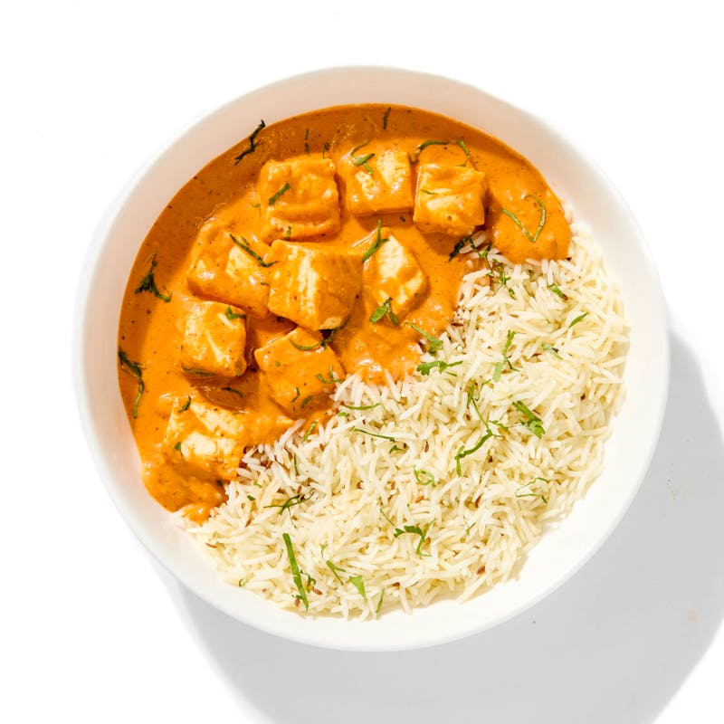Sugar, Fenugreek, Spice, Cardamom, Green, Whole, Paneer Cheese, Kashmiri Chili Powder, Butter, Kosher Salt, Red Onion, Cumin, Basmati Rice, Fennel Seed, Cilantro, Garlic, Heavy Cream, Ginger, Whole Canned Tomatoes, Cashews, Canola and Olive Oil Blend