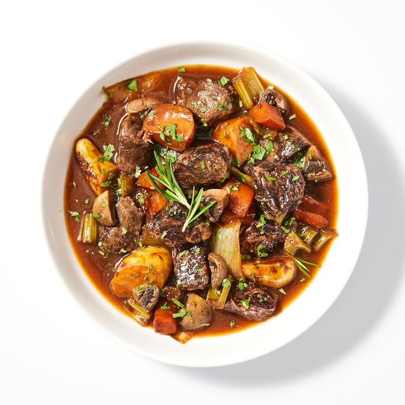 Mixed Fingerling Potatoes, LaFrieda, Beef, Cubed, Red Wine, Carrots, Buttom Mushroom, Onion, Celery, Canola and Olive Oil Blend, Beef Base, Corn Starch, Garlic, Rosemary, Thyme, Kosher Salt, Italian Parsley, Black Pepper