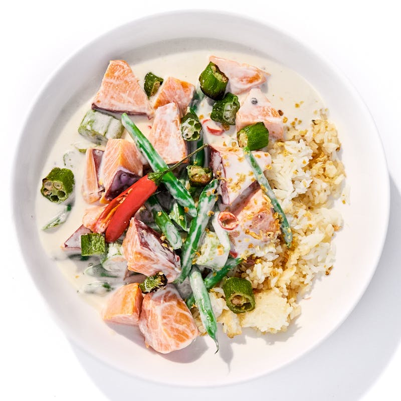 Canola and Olive Oil Blend, Garlic, Sweet Potatoes, Black Pepper, Garlic, Thai Chilli, Thai Red Peppers, Onion, Jasmine Rice, Kosher Salt, Green Beans, Gluten Free Tamari, Coconut Milk, Okra
