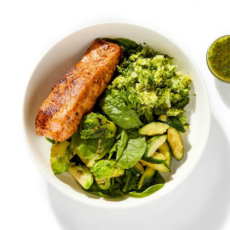 Inspired by the herb-forward sauces of Mexican cooking, this grain-free bowl features baked salmon seasoned with lemon, garlic, and paprika, paired with a vibrant chimichurri of cilantro, parsley, and cider vinegar. It’s served with a trio of greens—sautéed zucchini, wilted spinach, and roasted Brussels sprouts. High in protein and omega-3s, this dish is lean, clean, and green.