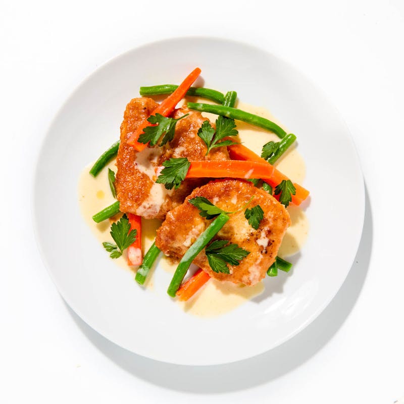 Chicken Breast, Carrots, Green Beans, Extra Virgin Olive Oil, White Wine, Parmesan Cheese, Lemon, Egg, Butter, All Purpose Flour, Onion, Kosher Salt, Chicken Base, Italian Parsley, Gum, Xanthan