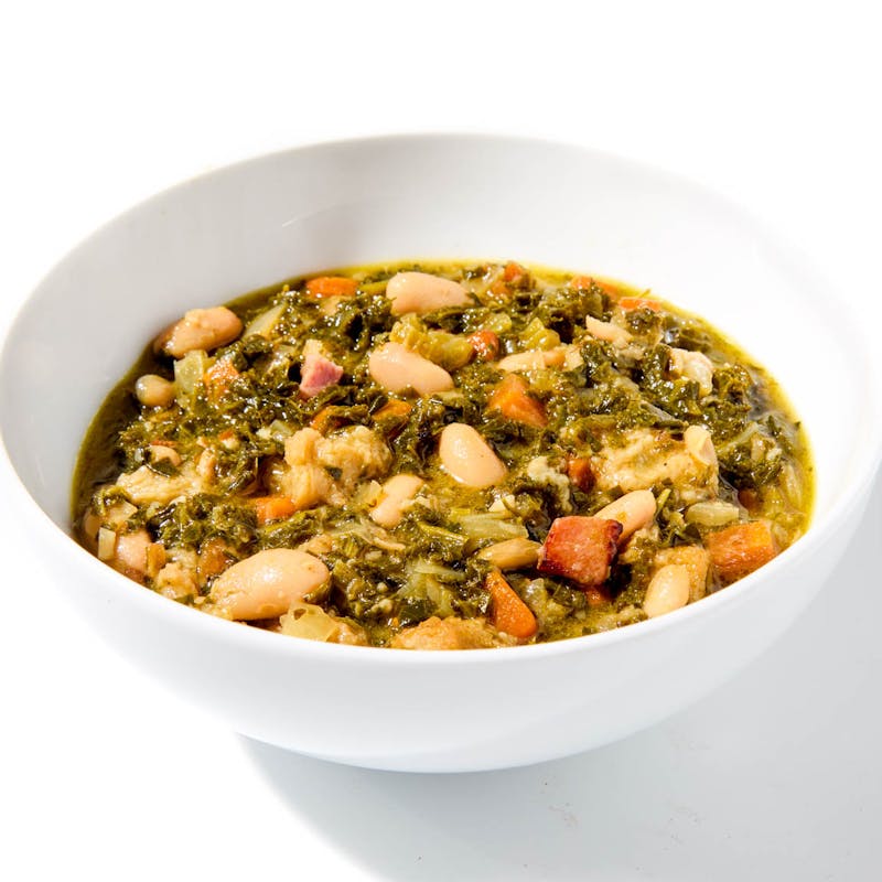 Ribollita was originally a way to use up leftover vegetables and day-old bread. Now, this stew-like soup is crafted with much more intention. The hero here is curly Tuscan kale, which adds a smoky flavor to sauteed celery, carrots, and onions. Combined with beans, and pancetta for a salty kick, this nourishing bowl is topped with slices of rustic baguette that melt into the soup as it simmers.