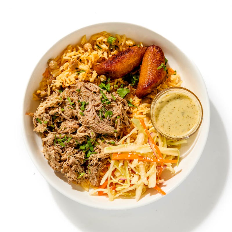 Built for comfort and ready for kickoff. This Latin-Caribbean mash-up stars slow-roasted pork shoulder over coconut basmati rice with pigeon peas and thyme. Sweet fried plantains and a crisp jicama slaw add balance, while a citrusy mojo sauce ties it all together.