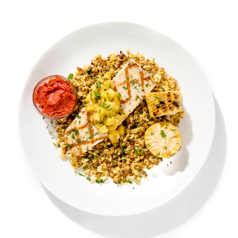 This Caribbean-inspired dish serves grilled mahi mahi over curried cauliflower rice, grilled corn on the cob, spicy habanero mango chow, and sun-dried tomato sauce on the side. Chef Chris recommends pairing with a glass of rosé or an ice cold lager!