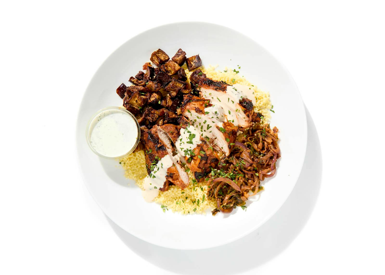 Grilled chicken thighs are marinated in a fragrant blend of garlic, lemon, and warm spices, then served with cumin-scented couscous and smoky roasted eggplant tossed with Medjool dates. Creamy yogurt-dill and nutty tahini sauces on the side bring coolness and depth.