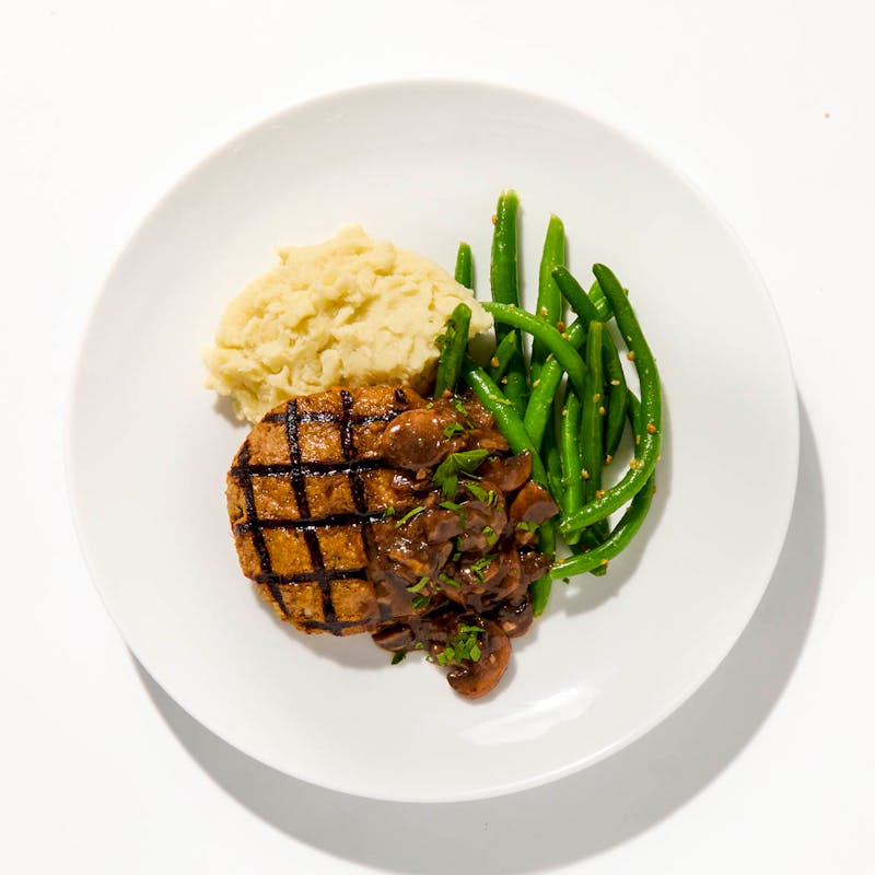 A lighter spin on a comfort classic, this turkey Salisbury steak starts with ground turkey mixed with breadcrumbs, Worcestershire, ketchup, and warm spices, then shaped into patties and grilled for smoky char. Each patty is blanketed in savory mushroom gravy, set over creamy mashed potatoes, and served alongside tender green beans, all finished with a sprinkle of fresh parsley.