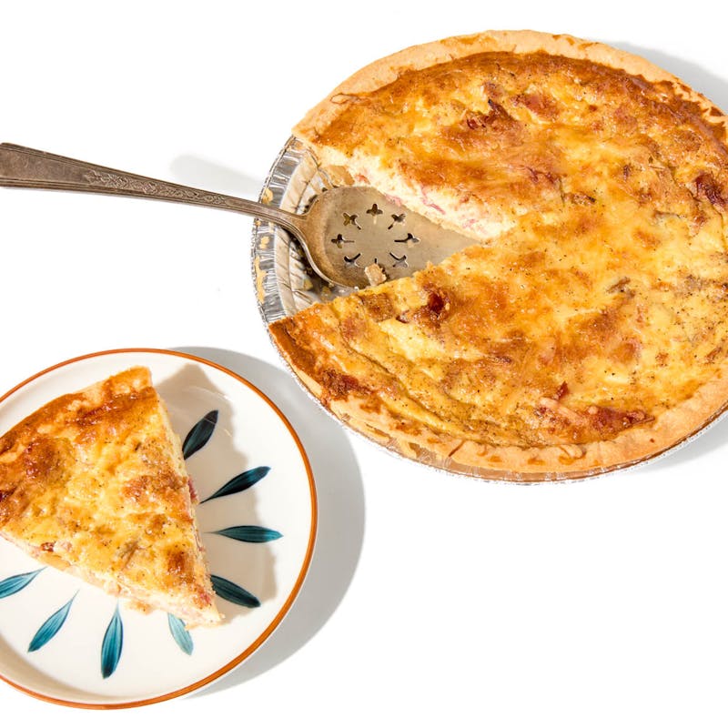 Egg, Half and Half, Bacon, Quiche Shell, Onion, White Cheddar Cheese, Heavy Cream, Extra Virgin Olive Oil, Kosher Salt, Butter, Nutmeg, Black Pepper, Balsamic Vinegar, Plain 10x10" Pizza Box