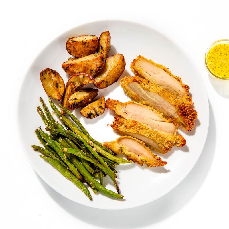 All Purpose Flour, Butter, Extra Virgin Olive Oil, Vegetable Base, Black Pepper, Garlic, Egg, Heavy Cream, Potato, Kosher Salt, Green Beans, Thyme, Lemon Juice, Chicken Breast, Ranch Dressing Powder, Panko Breadcrumbs, Parmesan Cheese